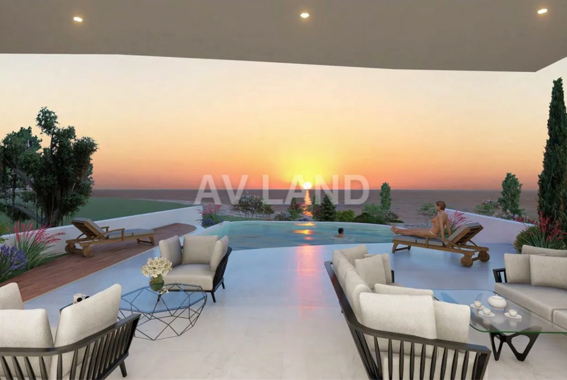 An exceptional luxury seafront residence located in one of the most prestigious areas of Chloraka, Paphos. Designed for discerning buyers seeking contemporary elegance and prime coastal living, this exquisite villa spans three levels — ground floor, first floor, and a stunning roof terrace offering panoramic views of the Mediterranean Sea. The villa boasts five spacious bedrooms, three bathrooms, and an additional guest WC. With a beautifully appointed open-plan layout, it includes a large living room, an elegant dining area perfect for entertaining, and a fully equipped kitchen with premium finishes. Outdoors, the villa features a private swimming pool, landscaped gardens, generous verandas, and a dedicated BBQ area, making it ideal for both relaxation and hosting. The roof terrace provides an exceptional setting for sunsets and sea views, delivering a true Mediterranean lifestyle experience. Located just moments from blue-flag beaches, luxury resorts, and Coral Bay, the villas are close to renowned schools, high-end shopping, archaeological landmarks, and essential amenities.